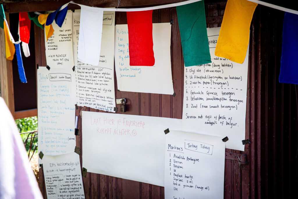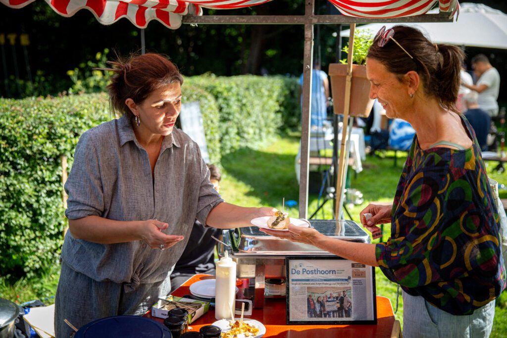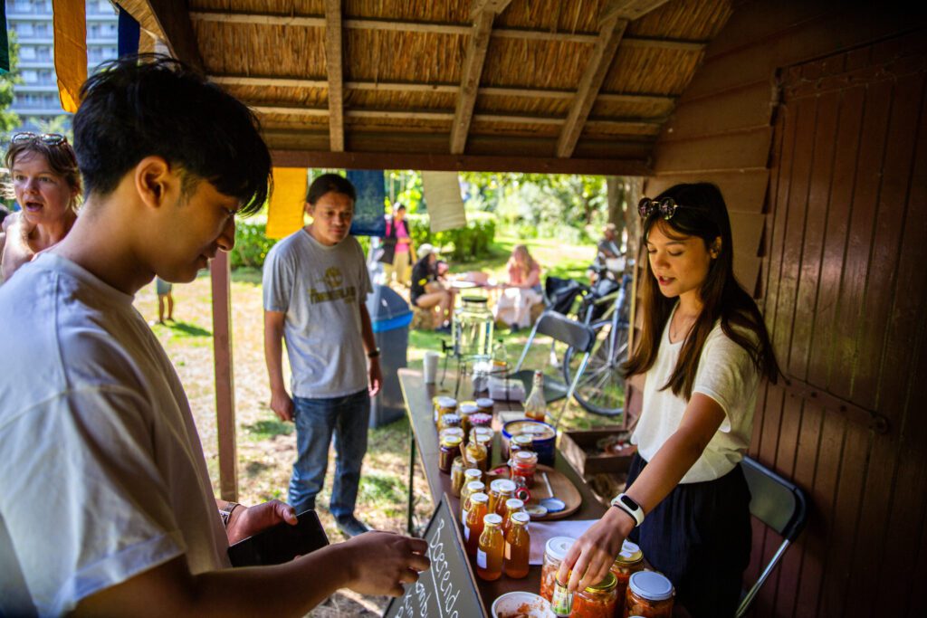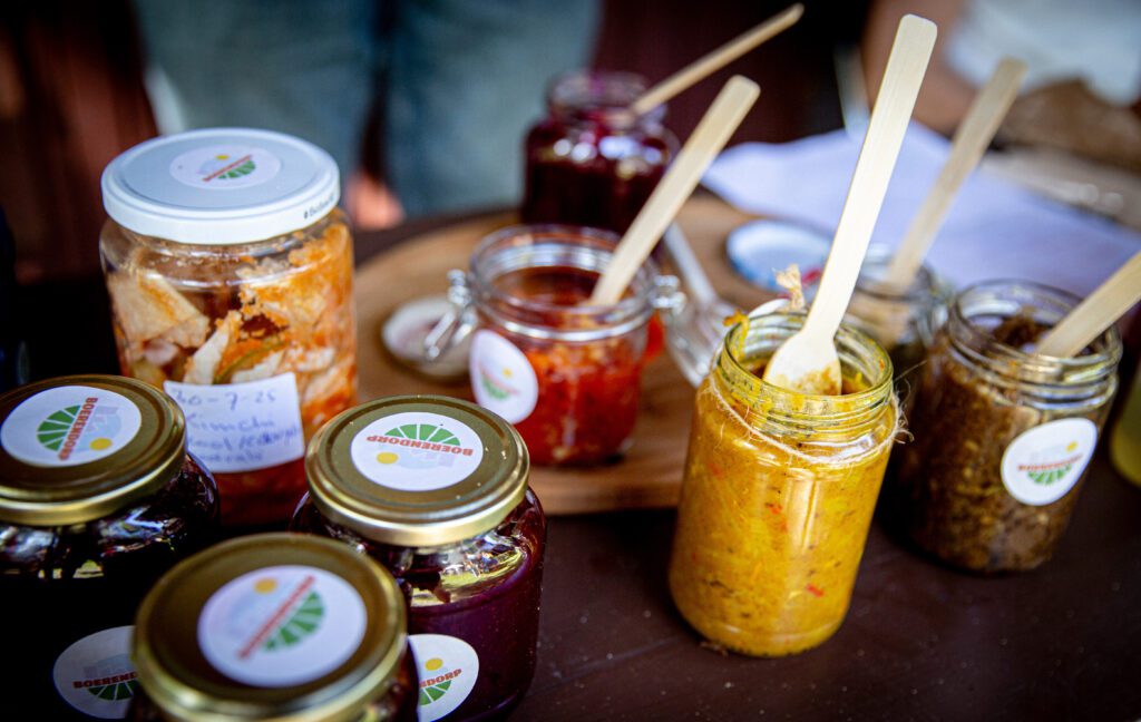 Wat stond er zoal op het menu? Tieners van de Kinderwinkel hadden groenten ingemaakt, er waren allerlei groentehapjes maar je kon ook lekker in het zonnetje zitten met een kopje courgettesoep. Sergio was er weer met zijn beroemde Chimichurri; die is dan ook écht te lekker om te missen. Voor de zoetekauwen waren er Marokkaanse pannenkoeken, donuts en potjes jam in verschillende smaken om mee naar huis te nemen. Chef Boerendorp presenteerde haar kimchi en perenchutney, bereid met groenten en fruit uit de tuin. Ook de tuinster was de keuken ingedoken en had voor deze gelegenheid kappetjes van daslook en Oost-Indische kers gemaakt.